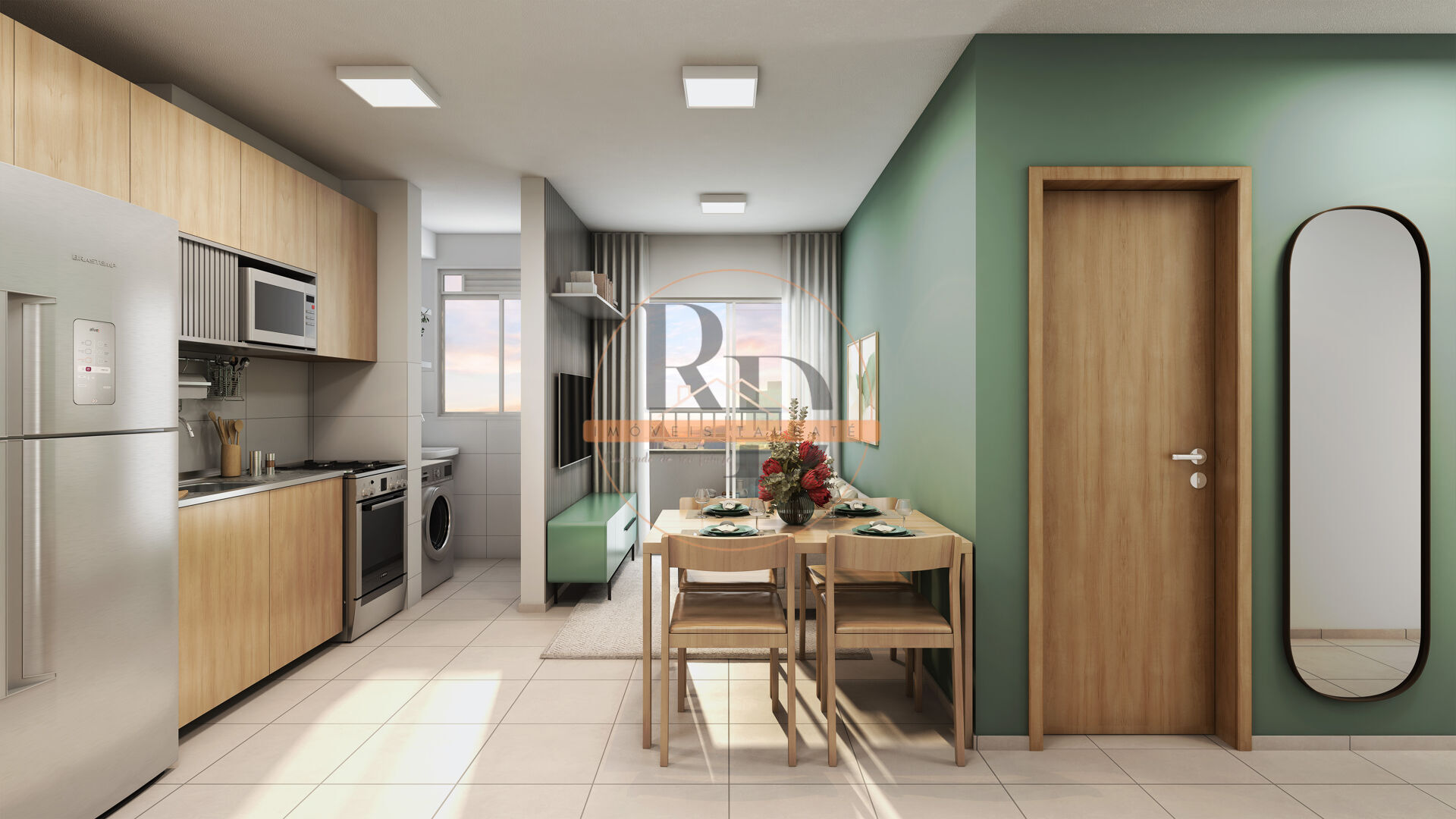 - Piso em cerâmica na sala, durável e de fácil manutenção