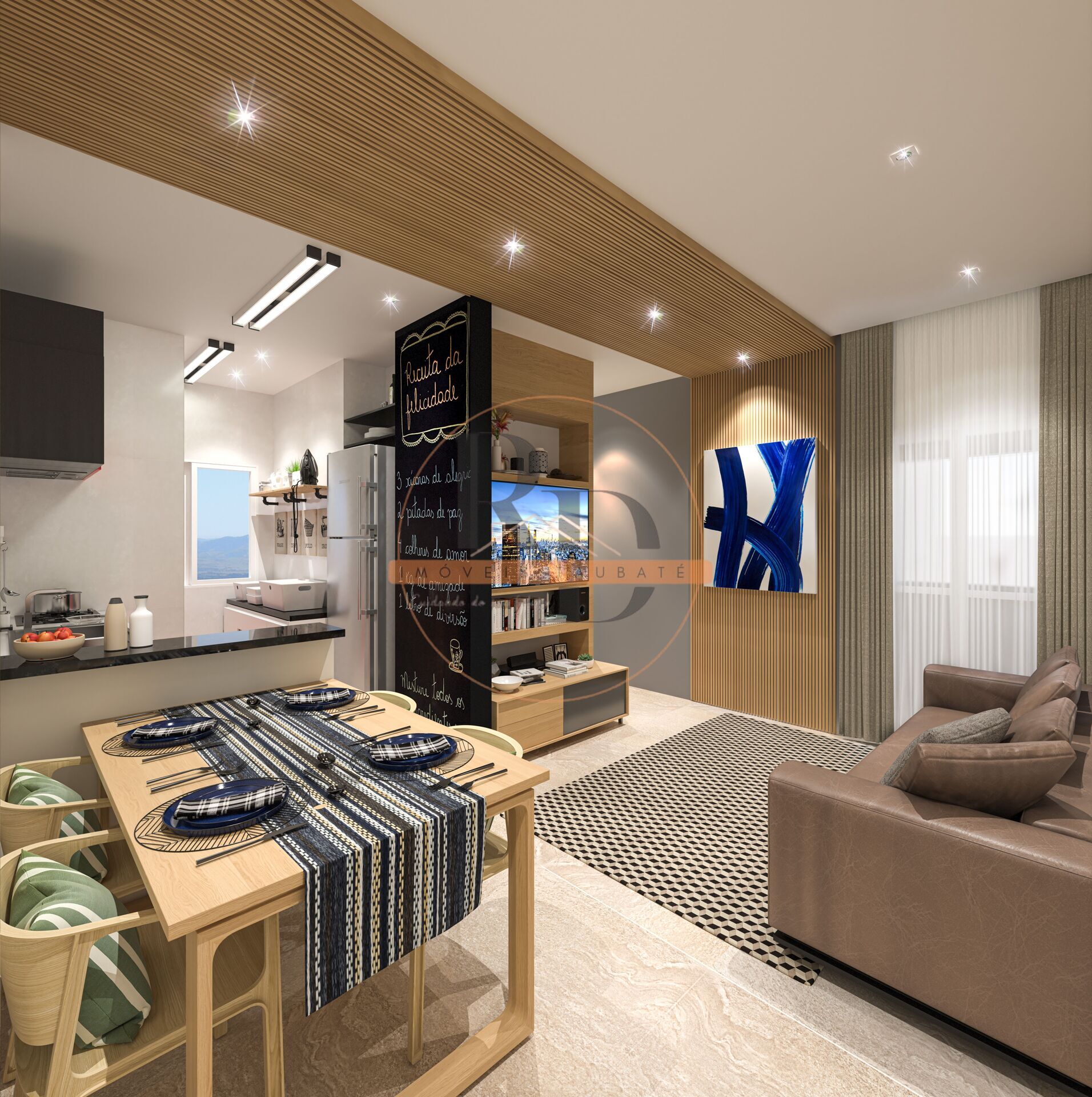 - 47m² com 2 dormitórios (1 suíte), banheiro social, sala dois ambientes, varanda e cozinha.